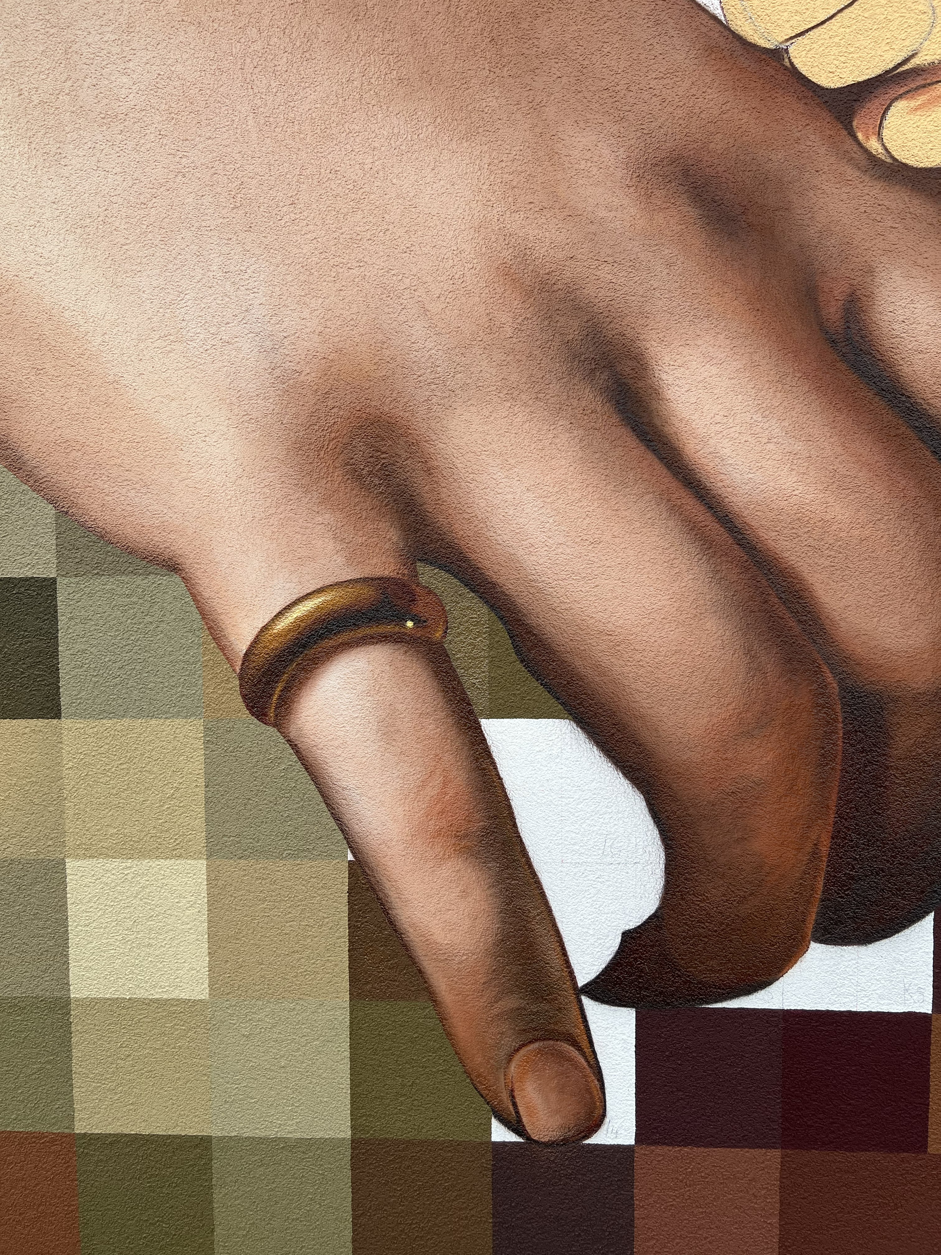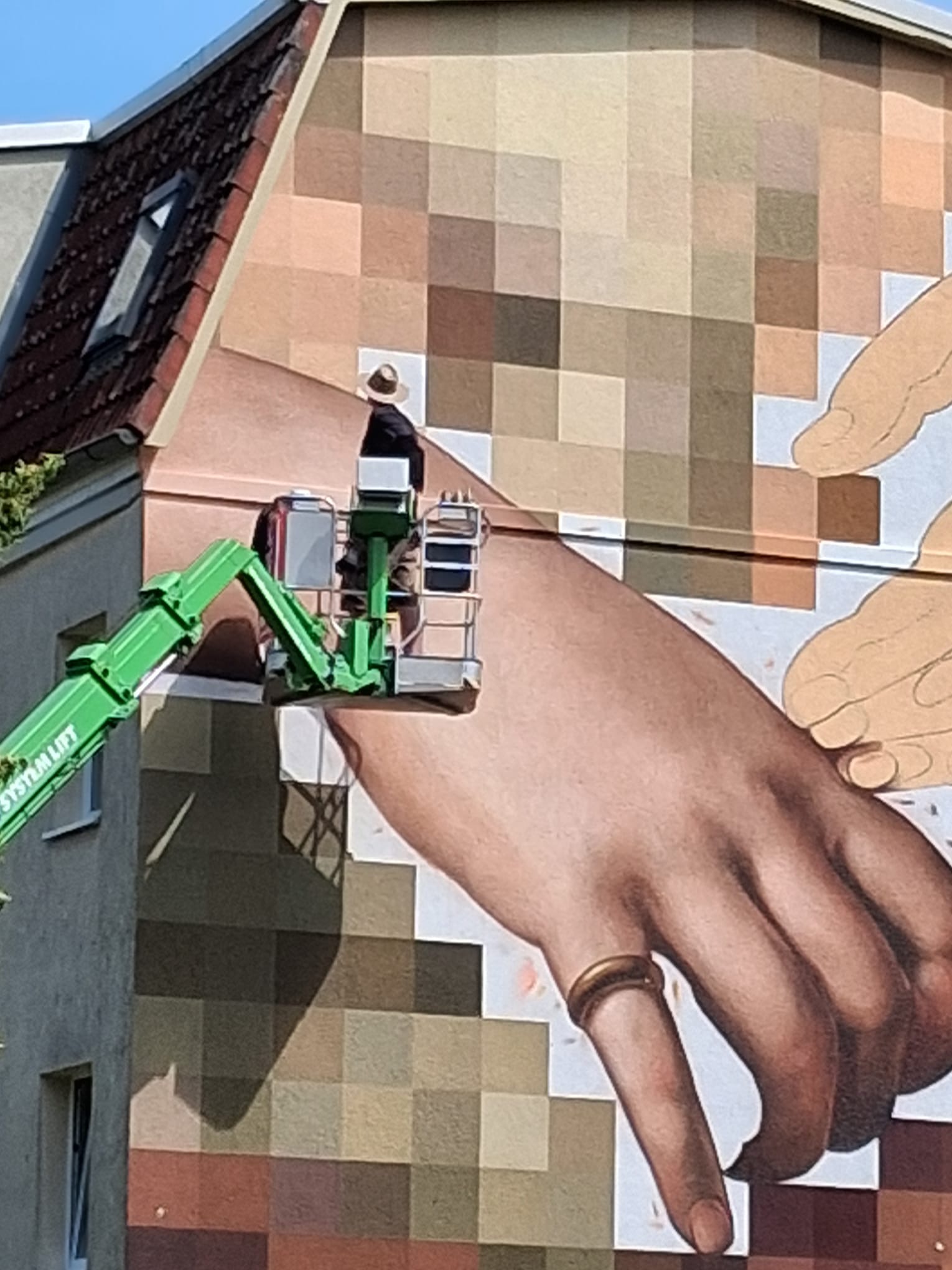 Tino Bittner hat in seinem jüngsten Projekt die Geste des Musikanten nicht nur aus dem Museum auf die Straßen Schwerins geholt und dort wahrhaft großgemacht. Er hat sie auch hervorgestellt, ohne sie aber aus dem Kontext des Bildes zu lösen. Einen Ausschnitt des Bildes hat er auf einer dreistöckigen Fassade abgebildet. Man sieht den Oberkörper des Musikanten mit den Händen. Doch alles außer den Händen ist – für zeitgenössische Sehgewohnheiten nicht ungewöhnlich – stark verpixelt. Die Hände dagegen behalten ihre illusionistische Darstellungsweise. Je mehr man herantritt, desto stärker löst sich der Grund in viele, jeweils einfarbige Bildquadrate auf, während der Illusionismus der Hände diese umso mehr hervorhebt.